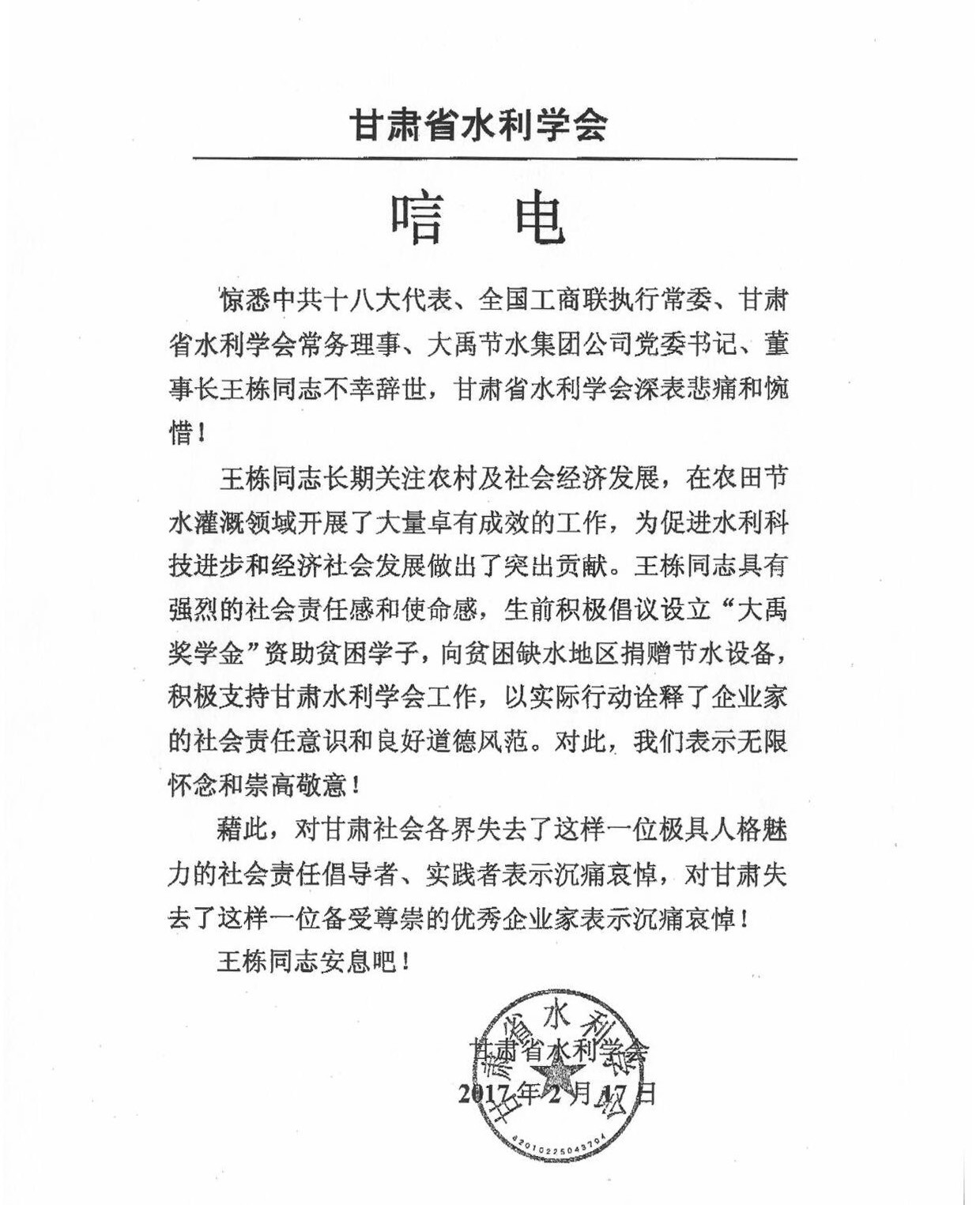 甘肃省水利学会唁电