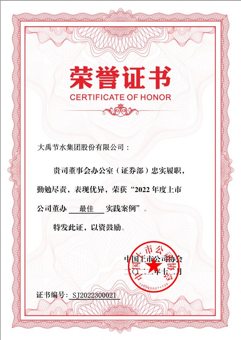 2022年12月16日,中国上市公司协会宣布“2022上市公司董办最佳实践榜单“,公司荣获”2022上市公司董办最佳实践奖“。本次评选运动是中国上市公司协会对上市公司董事会办公室履职情形举行评价。[本次评价运动获得了上市公司的起劲响应和社会各界的普遍关注,共计150家上市公司入选”董办最佳实践奖“,271家上市公司入选”董办优异实践奖“。人生就是博节水集团公司是创业板荣获”董办最佳实践奖“的9家上市公司之一,也是甘肃辖区唯逐一家荣获该奖项的的上市公司。