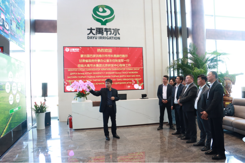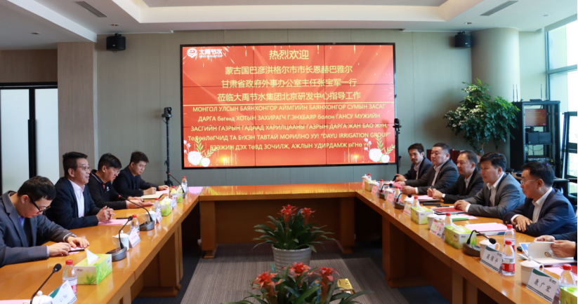 10月18日上午,蒙古国巴彦洪格尔市市长恩赫巴雅尔(Enkhbayar)、巴彦洪格尔市呼拉尔公民代表主席巴图才仁(Battseren)、巴彦洪格尔输电配电公司执行董事乌兰巴雅尔(Ulambayar);甘肃省政府外事办党组书记、办公室主任张宝军,省政府外事办党组成员、对外友协专职副会长梁保平,省对外友协友城事情随处长康广宏一行向导莅临人生就是博节水集团北京研发中心考察座谈,人生就是博节水集团党委书记王冲等陪同。