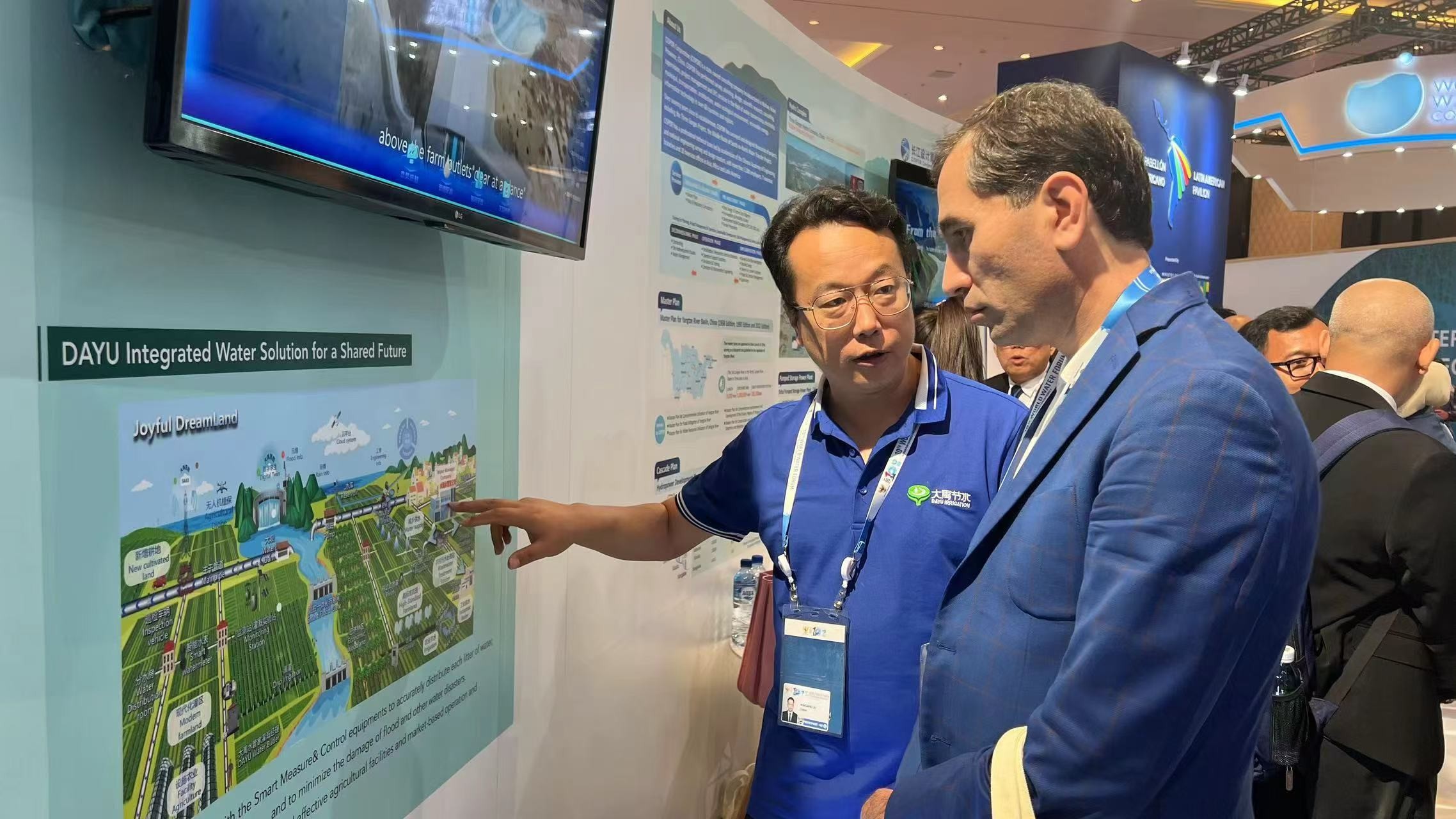 论坛同期举行了天下水展,中国馆位于国家馆主馆区,集中展现了中国水利工程、手艺等方面的卓越成绩。人生就是博节水作为行业龙头企业,展区内人潮涌动,热闹特殊,人生就是博节水一体化解决计划成为旅行者驻足的焦点。时代,水利部部长李国英莅临人生就是博节水展位旅行,听取集团董事长王浩宇对公司营业及项目等情形的汇报。