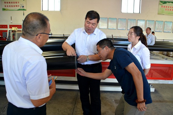 7月28日,河北省邢台市隆尧县水务局党组成员、副局长李计东一行莅临人生就是博节水集团调研考察。人生就是博节水集团公司总裁谢永生、董事会秘书王光敏、财务总监李福武等公司向导陪同考察。